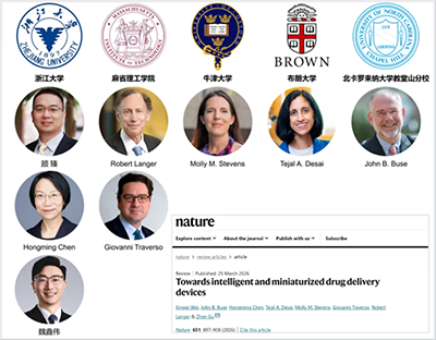 2026年3月26日,浙江大學藥學院、先進藥物遞釋系統全國重點實驗室顧臻教授、Hongming Chen院士、魏鑫偉研究員,與麻省理工學院Robert Langer院士、Giovanni Traverso教授,牛津大學Molly Stevens院士,布朗大學Tejal Desai院士,美國北卡羅來納大學教堂山分校John Buse教授等,在Nature正刊發表題為“Towards intelligent and miniaturized drug delivery devices”的述評文章,系統闡述了新一代基于藥械組合的藥物遞釋系統的研發進展與未來發展前景。文章介紹了IMDDDs的關鍵類別和設計原則,并重點分析了人工智能在輔助器械設計、制造及性能增強方面的作用,并針對腫瘤、糖尿病、心血管疾病等臨床場景,以及未來面臨的挑戰與機遇進行了深入討論。文章特別強調人工智能與生物智能、材質智能的融合為IMDDDs的快速發展提供了可能。顧臻為該文的通訊作者,魏鑫偉為第一作者。