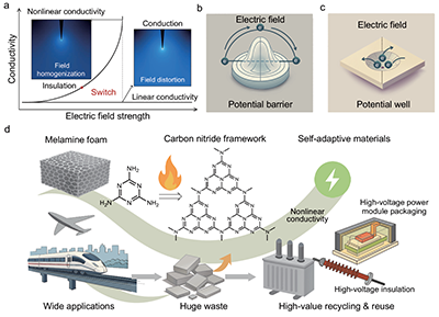圖1 勢阱型非線性電導材料的設計理念與應用構想。該圖對比了傳統界面勢壘機制與本研究提出的體相勢阱機制;并展示了制備思路,由廢舊三聚氰胺泡沫制備連續氮化碳骨架,并進一步制備勢阱型自適應介電材料