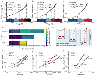 圖3 勢阱型非線性導電機制的定量分析。基于空間電荷限制電流模型,研究提取了不同材料體系中的勢阱參數,結果表明B摻雜傾向于引入深勢阱,P摻雜則形成淺勢阱,驗證了勢阱深度和勢阱密度對非線性導電行為的關鍵作用