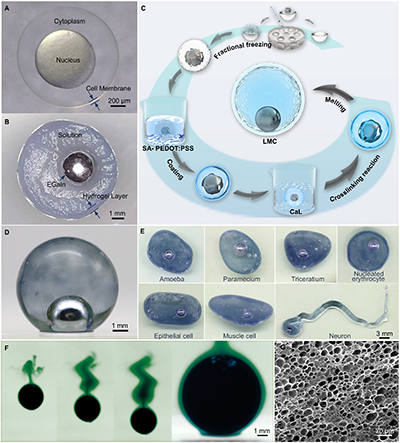 眾所周知,生物體渾然天成的細(xì)胞結(jié)構(gòu)主要由細(xì)胞膜、細(xì)胞質(zhì)和細(xì)胞核組成(圖1A),這為人工系統(tǒng)的制造提供了寶貴啟示。通過(guò)構(gòu)建最小液態(tài)金屬細(xì)胞單元,可以實(shí)現(xiàn)不同結(jié)構(gòu)和尺度的功能體。與生物細(xì)胞在自然活物質(zhì)系統(tǒng)中所處的層級(jí)一樣,液態(tài)金屬細(xì)胞代表了一大類擁有明確邊界、內(nèi)含功能溶液和介質(zhì)、能夠獨(dú)立響應(yīng)環(huán)境刺激的微型人工單元。在此篇論文報(bào)道的典型構(gòu)型中(圖1B),作者們引入金屬液滴作為細(xì)胞核,用以提供基本的感知、響應(yīng)和信息傳遞功能;周圍小腔室中的電解質(zhì)溶液則充當(dāng)細(xì)胞質(zhì),以促進(jìn)金屬核與外部環(huán)境之間的相互作用;而最外層的凝膠細(xì)胞膜旨在隔離各液態(tài)金屬單元,同時(shí)又起到維持雙電層對(duì)金屬內(nèi)核的主導(dǎo)作用,并允許胞內(nèi)物質(zhì)與外部環(huán)境之間的交換。文章建立了一種新型的多層構(gòu)建方法(圖1C),制造出了一系列形態(tài)和功能各異的多層柔性細(xì)胞結(jié)構(gòu)如阿米巴型、草履蟲(chóng)型、三角藻屬、紅細(xì)胞型、上皮細(xì)胞、肌肉細(xì)胞、神經(jīng)元等形態(tài)(圖1E)。圖1F進(jìn)一步展示了液態(tài)金屬細(xì)胞的滲透行為,反映出封裝在內(nèi)部囊泡中的色素溶液,在濃度梯度驅(qū)動(dòng)下向外部溶液環(huán)境中擴(kuò)散的情形。這些結(jié)構(gòu)特性使得液態(tài)金屬細(xì)胞能夠作為獨(dú)立的系統(tǒng),借助膜結(jié)構(gòu)與外界發(fā)生有效的物質(zhì)與信息交換。利用復(fù)合水凝膠固有的pH和溫度依賴性溶脹特性,可以動(dòng)態(tài)調(diào)節(jié)此類滲透過(guò)程。而基于外部刺激誘發(fā)出的膜孔徑的有效調(diào)控,則使得液態(tài)金屬細(xì)胞在可控藥物遞送方面的應(yīng)用也頗具潛力。文中提出的液態(tài)金屬細(xì)胞在原理上具有普遍意義,其組分、結(jié)構(gòu)和功能可根據(jù)需要在此基礎(chǔ)上不斷升級(jí)換代。雖然這些人工制成的液態(tài)金屬細(xì)胞與受代謝過(guò)程調(diào)控的生物實(shí)體間存在本質(zhì)區(qū)別,但它們成功復(fù)制了自然細(xì)胞的系統(tǒng)性作用,已展現(xiàn)出廣泛的環(huán)境適應(yīng)性和豐富的響應(yīng)特性,為構(gòu)筑更為綜合的功能體邁出了關(guān)鍵一步。