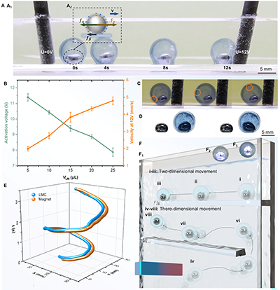 除了靜態(tài)響應(yīng)之外,定向運(yùn)動(dòng)能力對(duì)于液態(tài)金屬細(xì)胞與環(huán)境相互作用并執(zhí)行特定任務(wù)也至關(guān)重要。試驗(yàn)發(fā)現(xiàn),在直流電場(chǎng)作用下,溶液中的液態(tài)金屬細(xì)胞能夠產(chǎn)生有趣的定向旋轉(zhuǎn)(圖3),這種運(yùn)動(dòng)特性與小腔室中金屬內(nèi)核的體積以及外場(chǎng)電壓的幅值密切相關(guān)。同時(shí),水凝膠外膜的存在有效隔離了金屬內(nèi)核與外界電極的直接接觸,也避免了劇烈氧化,并作為機(jī)械傳動(dòng)履帶將金屬內(nèi)核的位移轉(zhuǎn)化為細(xì)胞整體的宏觀運(yùn)動(dòng)。而若將內(nèi)核替換為液態(tài)金屬磁性流體,還可實(shí)現(xiàn)對(duì)細(xì)胞運(yùn)動(dòng)和定位的三維時(shí)空控制,說(shuō)明液態(tài)金屬細(xì)胞具有很大的功能拓展潛力。