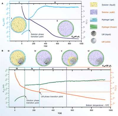 論文還特別探究了液態(tài)金屬細(xì)胞的耐寒特性,即極端低溫條件下的穩(wěn)定性和性能保持問(wèn)題,評(píng)估了液態(tài)金屬細(xì)胞從室溫快速冷卻至-13 ℃的響應(yīng)規(guī)律(圖4),發(fā)現(xiàn)由于同時(shí)包含凝膠、水溶液、液態(tài)金屬等組分,液態(tài)金屬細(xì)胞會(huì)表現(xiàn)出較之單一物質(zhì)更為復(fù)雜豐富的降溫相變過(guò)程。總體上,金屬內(nèi)核的引入通過(guò)相變誘導(dǎo)的熱緩沖從根本上改變了系統(tǒng)的熱行為,此種熱調(diào)節(jié)能力增強(qiáng)了液態(tài)金屬細(xì)胞的魯棒性,使其在極端環(huán)境條件下也能保持結(jié)構(gòu)完整性和功能化,這對(duì)于低溫保存或在惡劣環(huán)境中執(zhí)行任務(wù)等應(yīng)用較為關(guān)鍵。