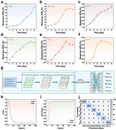 在本研究中,團隊開發了一種能夠共形貼附于天然植物表面的多功能電子皮膚,實現了對植物生理狀態的無損、實時監測。通過自下而上的策略構建了具有三層架構的SPM/HMA@P電子皮膚,將高柔韌性、強粘附性、生物相容性、室溫氣敏特性及多模態感知能力集成于單一平臺。在全封裝構型下,該器件可同時作為溫度與應變傳感器,成功實現了對葉片表面溫度與生長動態長達5天的連續原位監測。其可靠地捕捉了植物的生長節律與溫度變化,證實了該器件在真實自然條件下追蹤植物生理狀態的適用性。另一方面,在面向氣敏應用的半開放構型下,SPM/HMA@P能夠實時監測果品釋放的乙烯氣體,在0.5–100 ppm范圍內展現出高靈敏度,檢測限低至0.5 ppm,為采后果品品質評估提供了切實可行的工具。結合卷積神經網絡(CNN),該系統對果品特異性的乙烯信號實現了高達96.8%的分類準確率,突顯了其出色的智能識別能力。本研究為植物可穿戴傳感器提供了全新的材料平臺與設計策略,在精準農業、智慧農業及高通量植物表型分析等領域展現出廣闊的應用前景。