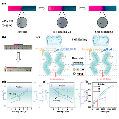 自愈特性:60℃、40%濕度條件下,6小時即可完全自愈,自愈后斷裂伸長率恢復至原始水平,熱電性能恢復率達89.7%;經過5次切割-修復循環后,其熱電與機械性能仍保持相對穩定。動態氫鍵與離子-偶極作用的可逆重組,是實現該自愈特性的核心機制。