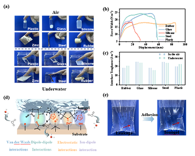 黏附性能:該材料在空氣及水下環境均可牢固黏附塑料、玻璃、硅膠、金屬等多種基底,水下剝離黏附強度為18.06~24.42 N/m,可作為水下密封材料用于孔洞修復;其優異黏附性能源于偶極 - 偶極作用、離子 - 偶極作用與范德華力等多重相互作用的協同效應。