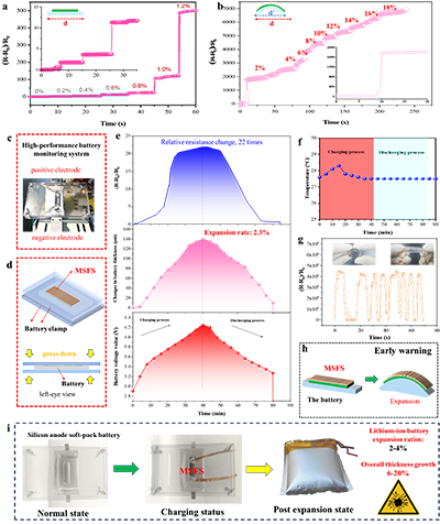 MSFS的潛在應用價值已得到初步驗證。在硅負極電池膨脹監測這一關鍵場景中,其表現出獨特優勢:當電池膨脹率僅2%時,其電阻變化高達22倍,能夠清晰區分電池的正常與異常膨脹狀態(圖4)。與傳統依賴溫度監測的電池安全方案不同,MSFS直接感知電池的物理形變,即便電池溫度尚未升高,也能提前發出預警。