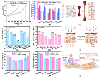 圖2 (a-c):力學性能及增強增韌機制;(d-f):氣體阻隔性能及機理;(g-i):耐老化性能及機理
