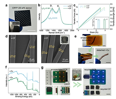 環氧通常作為工業產品中的組成部分而非單獨使用。一旦其中某個組件損壞,整個產品將被丟棄,造成大量浪費。這一室溫降解方法可應用于選擇性溶解復合材料和相關產品中的環氧樹脂,從而回收各種高價值組分。碳纖維布的編織結構、化學結構及力學性能和原始碳纖維保持一致(圖2b、2c、2d)。在自制的模擬變壓器中環氧包覆的銅制線圈模型的回收以及電路板灌封膠擦除實驗中,對于銅絲和電路元件在回收樹脂后也未產生明顯損傷(圖2e、2f、2g)。