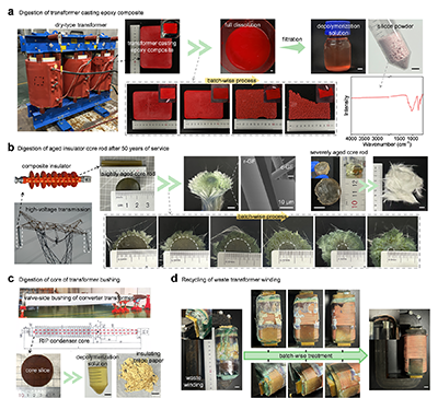 研究還展示了該室溫降解方法在回收電力系統中廢舊零部件的應用,例如干式變壓器中用于澆鑄的塊狀環氧復合材料(圖3a)、服役50年的500 kV廢舊復合絕緣子芯棒(圖3b)以及換流變壓器閥側套管(圖3c)。在樹脂基體完全溶解后,可回收得到其中的非環氧組分,例如硅粉填料、玻璃纖維和絕緣皺紋紙。垃圾場中的報廢變壓器繞組也可通過該方法除去老化的澆鑄環氧,回收得到完整銅制繞組和鐵芯(圖3d),有望再次澆鑄使用。