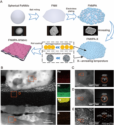 圖1. 設(shè)計思路及微觀結(jié)構(gòu)。 (A)FNMPA-X/fabric復(fù)合材料的制備過程及均勻化/再結(jié)晶退火策略示意圖。(B)FNMPA截面照片及EDX元素分布。(C-E)局部放大TEM圖像及SAED圖譜。
