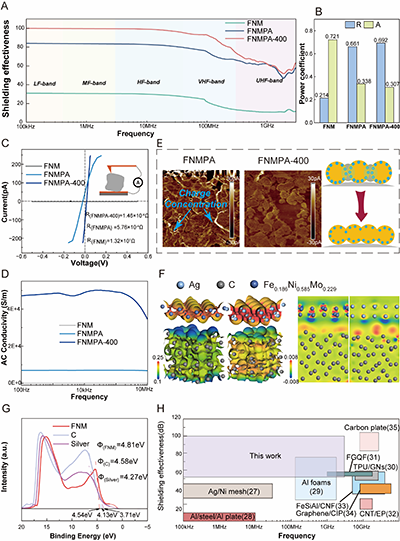 圖2. 電磁屏蔽及電性能。 FNM,FNMPA和FNMPA-400的(A)屏蔽效能,(B)功率系數(shù)及(C)單顆粒C-V曲線。(D)FNM、FNMPA、FNMPA-400的交流電導(dǎo)率。(E)FNMPA及FNMPA-400的CAFM圖像,插圖為銀納米顆粒退火前后的電荷分布示意圖。(F)FNM/C、C/Silver截面處的靜電荷及差分電荷密度。(G)Ag、C和FNM的UPS曲線。(H)FNMPA-400與其他工作的電磁屏蔽性能對比。