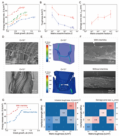 復(fù)合軟材料的設(shè)計(jì)需要不同機(jī)制的協(xié)同作用。首先改變基體的交聯(lián)比,實(shí)驗(yàn)與有限元模擬共同驗(yàn)證了低交聯(lián)比的強(qiáng)韌基體能有效防止基體破壞(圖4A-4E)。另外,研究人員發(fā)現(xiàn)無界面交聯(lián)的復(fù)合軟材料,起裂韌性明顯降低(圖4F-4G)。將制備條件不同的復(fù)合軟材料的斷裂性能繪制成熱力圖,可以發(fā)現(xiàn)只有高纏結(jié)的強(qiáng)韌基體與強(qiáng)界面共同存在時(shí),才能最大化地提升材料的起裂韌性并減小損傷區(qū)尺寸(圖 4H-4I)。