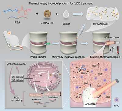 該治療平臺采用metoxy PEG-block-poly(L-alanine)(PEA)嵌段共聚物所形成的溫敏水凝膠來負(fù)載介孔聚多巴胺(mPDA)納米粒子,在微創(chuàng)注射后,可以精準(zhǔn)對椎間盤(IVD)部位進(jìn)行多次溫和的光熱療。引入的mPDA納米粒子發(fā)揮了雙重的治療益處——高效的光熱轉(zhuǎn)化和強(qiáng)有利的活性氧(ROS)清除效果,同時,水凝膠基質(zhì)能在IVD內(nèi)長期保留,從而在單次注射后實現(xiàn)了對病灶部位持續(xù)的熱療干預(yù)。該治療平臺不僅緩解了IVDD進(jìn)程中非特異性疼痛癥狀,還干預(yù)了IVDD的核心病理進(jìn)程,起到“治標(biāo)治本”的作用。