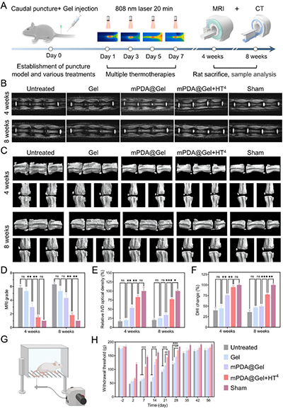 圖2. 熱療水凝膠治療平臺體內(nèi)干預(yù)IVDD進(jìn)展和緩解疼痛的效果。