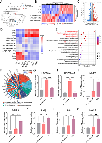轉(zhuǎn)錄組結(jié)果分析顯示,mPDA納米粒子的引入加上其介導(dǎo)的多次溫和光熱療對于炎性環(huán)境下的髓核細(xì)胞(NPCs)發(fā)揮了雙重干預(yù)作用,不僅能通過上調(diào)熱休克蛋白(HSPs)來干預(yù)ECM的合成代謝,還能通過清除ROS來下調(diào)IL-17和TNF炎性信號通路,從而干預(yù)ECM的降解代謝(圖3)。
