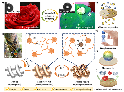 圖 1. 具有疏水轉換功能的仿生涂層。(a)玫瑰花瓣和荷葉結構的示意圖。圖中插圖展示了仿生涂層的水接觸角變化情況,表明其具有半疏水-超疏水的轉換特性。(b)漆樹的示意圖以及通過漆酚-Fe3+配位網絡制備非織造布基涂層的工藝流程。該涂層的應用領域包括(c)油水分離、(d)液滴轉移、(e)微反應器以及(f)抗菌和止血方面。