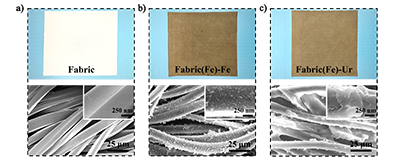 圖 2. 原始和改性非織造布的表面形態及化學成分。(a)織物、(b)織物(Fe)-鐵、(c)織物(Fe)-漆酚的照片及場發射掃描電子顯微鏡圖像。