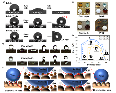 圖 3. 原始和改性非織造布的表面潤濕性。(a)在 Fabric、Fabric(Fe)-Fe 和 Fabric(Fe)-Ur 上測量的水接觸角和滾動角度。數據以平均值±標準差的形式呈現,n = 3。(b)不同改性基底表面(濾紙、非織造布、鋼網和 PVDF 膜)上不同液滴(焦油、水、牛奶和咖啡)的照片。(c) Fabric(Fe)-Fe 和 Fabric(Fe)-Ur 上水滴動態變化的照片。(d)水滴接觸非織造布(Fabric(Fe)-Fe 和 Fabric(Fe)-Ur)前后的力-距離曲線,圖中插圖顯示了相應位置水滴形狀的光學圖像。(e)改性非織造布與水滴之間相互作用模型的示意圖。