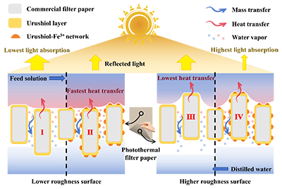 圖 4. 展示了在 PMD 工藝過程中,由漆酚金屬網絡形成的不同粗糙度的疏水表面對光吸收和熱傳遞所產生的影響的示意圖。