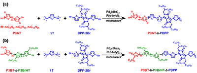 圖2.(a)P3AT-b-PDP和(b)P3BT-b-P3BrHT-b-PDPP的合成路線圖。
