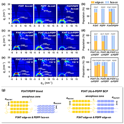 圖3. P3HT和PDPP均聚物、P3HT/PDPP共混物以及不同分子量P3HT-b-PDPP嵌段共聚物退火前后的(a,c,e)2D-GIWAXS圖和(b,d,f)對應的edge-on和face-on比例圖;(g)P3HT/PDPP共混物和P3HT(H)-b-PDPP嵌段共聚物的結構示意圖。
