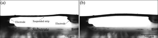圖1. 懸空放置的條狀碳納米管/殼聚糖聚合物薄膜在電壓關(guān)(a)和電壓開(b)的條件下的光學(xué)圖片