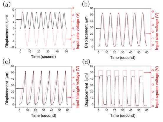 圖2. 在不同波形的電壓信號下(紅色曲線)下25wt%的碳納米管/殼聚糖聚合物薄膜的振動位移情況(黑色曲線),其中(a)為施加0.1Hz的正弦波(±2.5V),(b)為施加0.1Hz的正向正弦波(0~5V),(c)為施加0.1Hz的正向三角波(0~5V),(d)為施加0.1Hz的正向方波(0~5V)