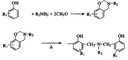 聚苯并惡嗪樹脂作為一種新型酚醛樹脂,不僅具有優異的耐熱性和阻燃性,而且克服了傳統酚醛樹脂在成形固化過程中釋放小分子的缺點,在制備高性能材料方面已引起研究者的廣泛關注。以酚類化合物、胺類化合物和甲醛為原料合成的苯并六元雜環化合物——苯并惡嗪單體,最初在Mannich反應中發現,可在加熱和(或)催化劑作用下發生開環聚合反應形成聚苯并惡嗪樹脂。與一般的酚醛樹脂相比,聚苯并惡嗪樹脂在成型固化過程中沒有小分子放出,制品孔隙率低,接近零收縮。另外,在分子設計中有更大的靈活性,可認為是一種新型的酚醛樹脂。
