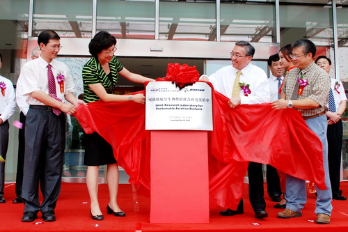 9月2日,由中國科學院青島生物能源與過程研究所與美國波音公司共同組建的“可持續航空生物燃料聯合研究實驗室”揭牌儀式在青島舉行。青島市委常委、副市長張惠,波音公司副總裁、波音(中國)投資有限公司總裁王建民(David Wang),中國科學院國際合作局副局長曹京華,青島能源所所長王利生等共同為聯合實驗室揭牌。