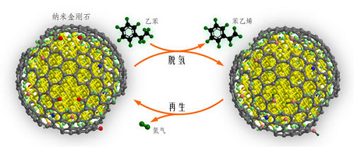 中科院金屬研究所沈陽材料科學國家(聯合)實驗室催化材料研究部蘇黨生研究員、張建研究員、王銳博士與德國Fritz Haber研究所、中科院長春應化所、克羅地亞研究人員合作,借助在納米金剛石表面上高度彎曲的氧摻雜石墨烯活性結構,在無氧、無水蒸氣保護的低溫條件下實現了乙苯直接脫氫制取苯乙烯,其催化活性大約為工業氧化鐵催化劑的3倍,反應過程中沒有積碳產生且金剛石催化劑表面保持清潔,在乙苯脫氫工業領域具有良好的應用前景。這一工作以快訊形式于10月1日在Angewandte Chemie International Edition在線發表,全文鏈接為http://onlinelibrary.wiley.com/doi/10.1002/anie.201002869/abstract)。