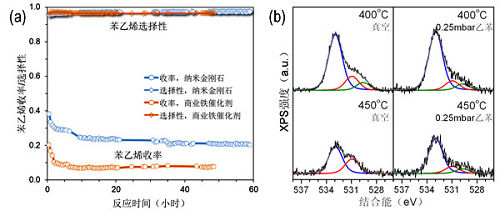 圖2 納米金剛石催化性能與原位表征結果:(a)550oC無水條件下乙苯直接脫氫活性,反應條件:50mg催化劑,2.8%乙苯,氣體流速10 mL/min,1 atm;(b)400~450oC真空及乙苯蒸氣下原位高壓同步輻射XPS譜圖。