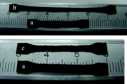 含偶氮苯聚氨酯的形狀記憶效應:(a)25℃下的原始形變;(b)75℃下拉伸后25℃固定的暫時形變;(c)加熱至75℃后回復到原始形變