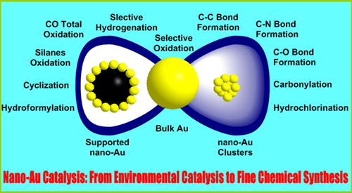 納米金催化是催化化學的熱點研究領域之一,國內外催化工作者圍繞納米金催化劑的制備及其催化性能研究開展了大量研究工作。在國家自然科學基金委和中科院的支持下,中國科學院蘭州化學物理研究所綠色化學與催化中心自2000年以來圍繞納米金催化開展了一系列研究工作并取得較好進展。代表性的工作如首次實現納米金催化胺氧化羰化制備N-取代氨基甲酸酯、首次實現納米金催化低溫水蒸汽變換選擇性還原硝基苯類化合物、首次實現擔載納米金催化活化二氧化碳制備環狀碳酸酯以及發展出非焙燒高活性納米金催化劑制備方法等。相關研究工作在Appl. Catal., B: Environ. (2001, 31, L1-L4; 2006, 66, 241-248)、J. Catal.(2002, 211, 548-551; 2009, 261, 241-244)、Chem. Commun.(2003, 2192-2193; 2009, 653-655; 2011, 47, 6476-6478)、J. Am. Chem. Soc.(2005, 127, 4182-4183)、Appl. Catal., A: Gen.(2008, 340, 220-228)、Dalton Trans.(2008, 2542-2548)等刊物發表一系列研究論文。