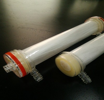 寧波材料所功能膜課題組,進(jìn)行了系統(tǒng)的基礎(chǔ)研究,從聚乳酸體系的成膜熱力學(xué)及動力學(xué)機理,到微結(jié)構(gòu)的控制,最終通過精確調(diào)控相轉(zhuǎn)化工藝及原位聚合接枝肝素,得到了一系列壁厚為40~100μm,內(nèi)徑為200~450μm的聚乳酸基中空纖維膜,并制備成血液透析膜組件。其超濾系數(shù)PWP達(dá)到42ml/H·m2·mmHg,對小分子尿素的清除率達(dá)到175ml/min,對中分子物質(zhì)溶菌酶的清除率達(dá)到33%,對大分子蛋白BSA的截留率達(dá)到95%以上。該生物基聚合物中空纖維透析膜的制備方法已經(jīng)申請了國家發(fā)明專利(201210547368.0),有望用于新一代的血液透析器。