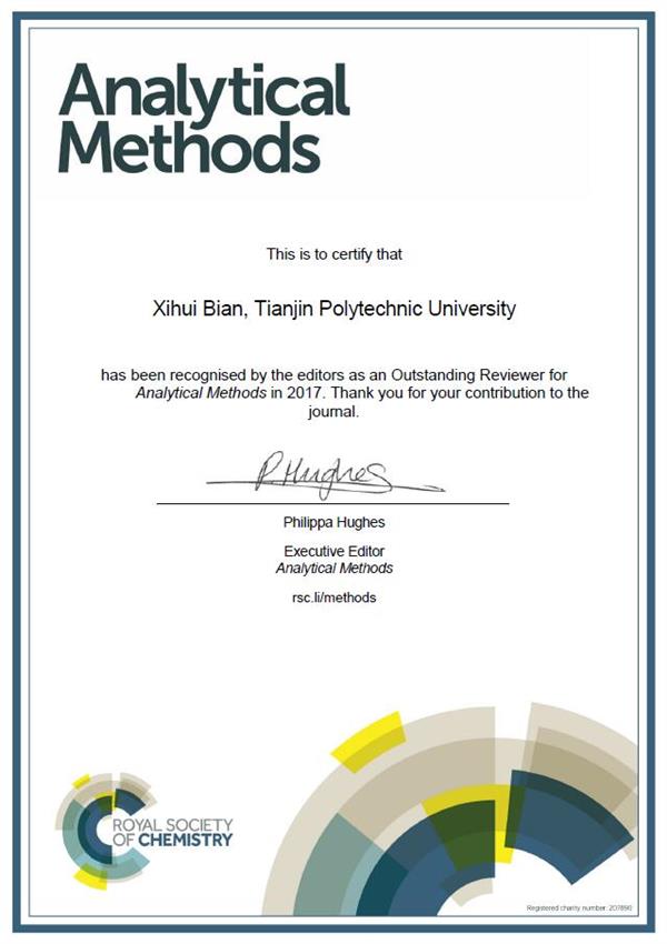 卞希慧被英國皇家化學會旗下的Analytical Methods期刊評為2017年度杰出審稿人。