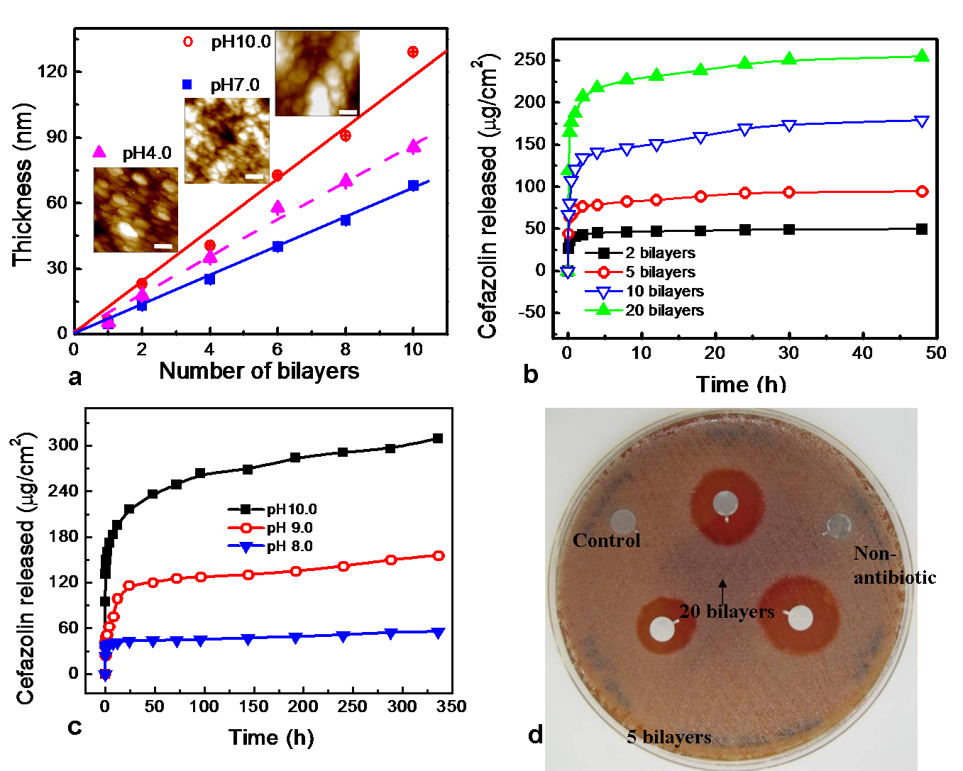 Fig.2. Tunable drug loading and releasing from anti-infection peptide nanocoatings. (a) Nanoassembly with nano-scale structure; (b) Controllable antibiotic incorporation; (c) Tunable releasing of antibiotics; (d) Anti-bacterial activity with Kirby-Bauer assays.