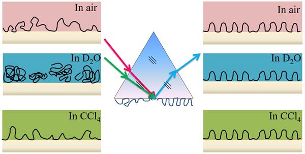 我們在藍寶石界面上制備了強吸附和弱吸附的高分子鏈,在良溶劑和非溶劑的作用下利用和頻振動光譜探測界面聚苯乙烯高分子鏈的構象。證實了強吸附的高分子鏈在界面比較剛硬,弱吸附的高分子鏈在界面比較柔軟。由于提供了分子鏈柔性與否的直接證據,文章作為Communication和front cover發表。