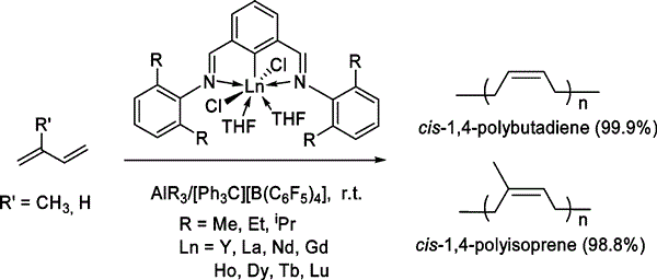 keywords:aryldiimine NCN-pincer ligated,homogeneous Ziegler-Natta catalyst system, excellent cis-1,4 selectivities, Ln-Al bimetallic cations