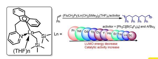 ②基于芴亞甲基吡啶配體的稀土全系雙烷基配合物可以高效的催化苯乙烯高間規選擇性聚合。這些配合物的聚合活性與其中心金屬密切相關,中心金屬離子半徑越小,其催化苯乙烯聚合的活性越高。通過研究烷基鋁、外給電子體和溶劑對于聚合反應的影響,并結合DFT計算發現苯乙烯配位是稀土催化劑催化苯乙烯聚合決速步驟。