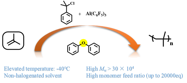 We report here by using a binary initiating system containing a sterically bulky Lewis super acid Al(C6F5)3 together with cumyl chloride (CumCl), the cationic polymerization of isobutylene was realized at temperatures varying from -60 ?C to 15 ?C in a non-halogenated solvent to afford polymers with medium molecular weights from 0.9 ×104 to 14.8 ×104 g?mol-1.   Moreover, addition of EDs (EDs =OPh2, SPh2 and NPh3) to the above system generated ternary systems, leading to obvious improvement of the catalytic performances.   Among these systems, Al-CumCl-OPh2 was mostly efficient to transfer up to 20,000 equiv. IB into PIBs with high molecular weights up to 35.5 ×104 g?mol-1. at -40?C.  The activation energies (Ep) for the polymerization degree with different initiating systems were determined, suggesting that the molecular weight of PIB was strongly dependent on the polymerization temperature.