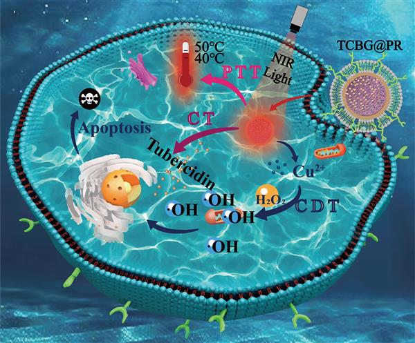 Abstract:Combinations of different therapeutic strategies, including chemotherapy (CT), chemodynamic therapy (CDT), and photothermal therapy (PTT), are needed to effectively address evolving drug resistance and the adverse effects of traditional cancer treatment. Herein, acamouflage composite nanoformulation (TCBG@PRs), an antitumour agent (tubercidin, Tub) loaded intoCu-doped bioactive glasses (CBGs) and subsequently camouflaged by polydopamine (PDA) and red blood cell membranes (RBCm), was successfully constructed for targeted and synergetic antitumour therapies bycombining CT of Tub, CDT of doped copper ions, and PTT of PDA. In addition, the TCBG@PR composite nanoformulation was camouflaged with a red blood cell membrane (RBCm) to improve biocompatibility, longer blood retention times, and excellent cellular uptake properties.It integrated with long circulation and multimodal synergistic treatment (CT, CDT, and PTT) with the benefit of RBCms to avoid immune clearance for efficient targeted delivery to tumor locations, producing an "all in one" nanoplatform.In vivo results showed that the TCBG@PR composite nanoformulation prolonged blood circulation and improved tumor accumulation. The combination of CT, CDT, and PTT therapies enhanced antitumour therapeutic activity, and light-triggered drug release reduced systematic toxicity and increases synergisticantitumor effects.