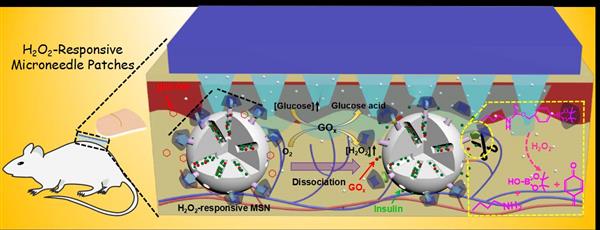 Abstract: A glucose-mediated insulin delivery systems would be highly satisfactory for diabetes diagnosis depended on the concentration of blood glucose in the body. Herein, a novel microneedles (MNs) delivery device integrated with insulin-loaded and H2O2-responsive mesoporous silica nanoparticles (MSN), was designed to achieve fast and painless administration. The MSN was obtained by modification by 4-(imidazoyl carbamate)phenylboronic acid pinacol ester (ICBE) and following a host-guest complexation between ICBE and α-cyclodextrin (α-CD). Drug and glucose-responsive factor, namely insulin and glucose oxidase (GOx), were encapsulated into the MSN. GOx in MSN could convert glucose to gluconic acid and generate hydrogen peroxide (H2O2). The phenylboronic ester on the surface of MSN could be oxidized in the presence of H2O2 that resulted in the destructive of host-guest complexation, leading to disassemble of the drug loaded MSN and subsequent release of the preloaded insulin. After transdermal administration to the diabetic rats, an effective hypoglycemic effect was obtained by detecting over time, compared with that of subcutaneous injection. This work suggests that the as-prepared glucose-mediated and H2O2-responsive MNs systems have a promising application in diabetes treatment.