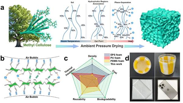 Abstract: The plastic pollution crisis demands sustainable alternatives to petroleum-based foams. Cellulose-based foams, renewable and biodegradable, are a good candidate. In this study, fully degradable cellulose foams are fabricated from methyl cellulose (MC) alone via a simple, additive-free method. The method combines mechanical foaming and oven drying without blowing, stabilizing, or cross-linking agents. First, stable wet foam is obtained by mechanically agitating an aqueous MC solution. Amphiphilic MC molecules stabilize the foam at the air-water interface. During oven-drying, the thermal gelation of MC solidifies the structure into solid foam. The resulting MC foam has a very low density (10.02 mg·cm-3), high porosity (99.28 %), and excellent thermal insulation (thermal conductivity as low as 37.35 mW·m-1K-1). It also has moisture-induced form interlocking capability, retaining 89.5 % of its original tensile strength when form-interlocked and adhering well to common packaging materials. Additionally, the MC foam can be chemically modified for extra functionalities like flame retardancy and hydrophobicity. This research presents a new way to fabricate lightweight, moisture-induced form interlocking, and eco-friendly cellulose foams as a sustainable and versatile alternative to conventional plastic foams.