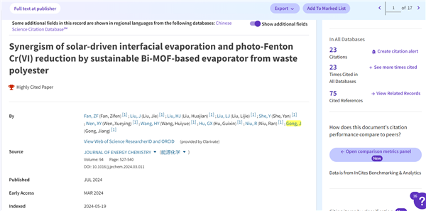 祝賀!課題組新增1篇論文入選ESI高被引論文 (Top 1%),累計第19篇