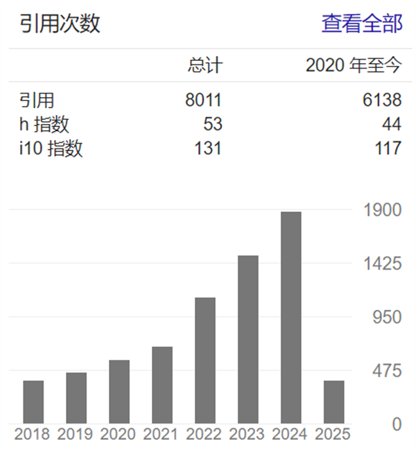 2025年2月6日,2025年的被引用次數(shù)為390,2025年的被引用次數(shù)有望突破2200~2400次,從而使得總的被引用次數(shù)達到9800~10100次