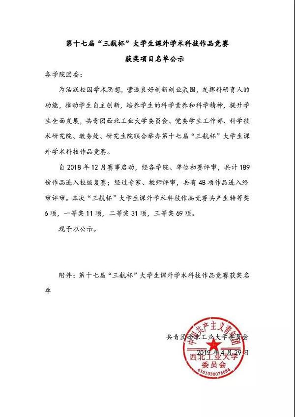 日前,共青團西北工業大學委員會公示了西北工業大學第十七屆“三航杯”大學生課外學術科技作品競賽獲獎名單。