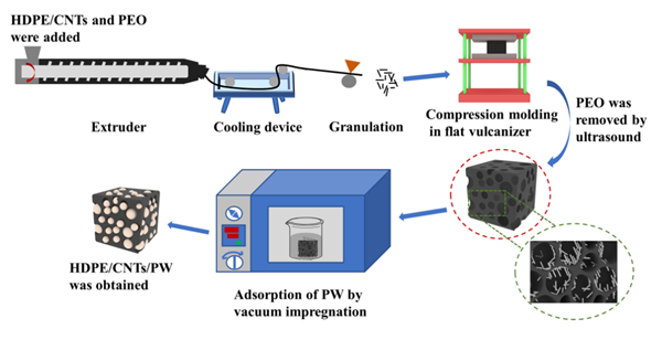 泄漏風險和低導熱率嚴重阻礙了有機相變材料的廣泛應用。本研究結合犧牲模板法、熔融共混法和水溶劑蝕刻法成功制備得到高密度聚乙烯(HDPE)/碳納米管(CNTs)多孔骨架。隨后,采用簡單的真空浸漬法制備得到一系列HDPE/CNTs/石蠟(PW)復合相變材料。所得HDPE/CNTs多孔支架可有效避免PW的泄漏,且與HDPE/PW-3:7相比,HDPE/CNTs/PW-3:7的熱導率和電導率分別提高了2.94倍和13個數量級,同時,該復合相變材料還具有較高的相變焓(熔化焓為153.95 J/g,結晶焓為152.82 J/g)。綜上所述,HDPE/CNTs/PW-3:7在光熱轉換、電熱轉換及熱能存儲等領域具有廣闊的應用前景。