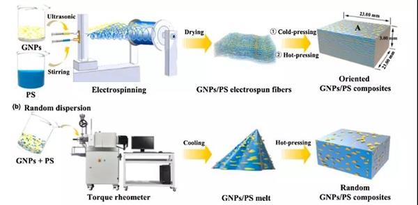 Abstract: Polymer composites with dual functions of thermal conductivity and electromagnetic interference (EMI) shielding are hardly reported. Herein, we fabricated polystyrene (PS) based composites containing interconnection oriented graphite nanoplatelets (GNPs) by the combining method of electrospinning, cold-pressing followed by hot-pressing. In-plane thermal conductivity (λ//) and total SE (SET) of the oriented GNPs/PS composites with 35 wt% GNPs reached 4.72 W/mK and 33 dB, about 24 and 11 times higher than that of λ= (0.20 W/mK) and SET (3 dB) of pure PS matrix, and also higher than that of λ// (3.05 W/mK) and SET (16 dB) of the random 35 wt% GNPs/PS composites. However, the cross-plane λ (λ⊥) value for oriented GNPs/PS composites was slightly enhanced from 0.20 W/mK to 0.32 W/mK. This work provides a simple and effective method to construct continuously thermally/electrically conductive networks, and the obtained GNPs/PS composites have great application potential in the electronic fields.