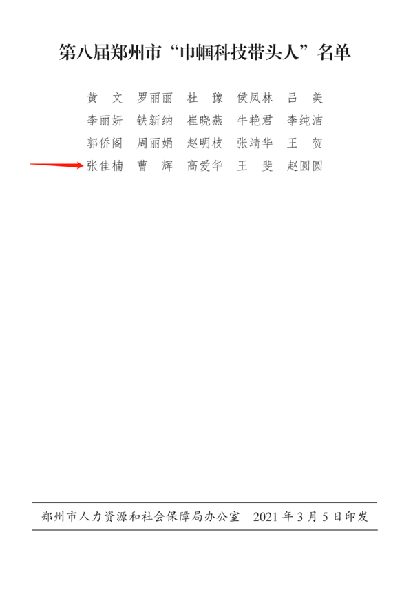 恭喜課題組組長張佳楠教授獲評第八屆鄭州市“巾幗科技帶頭人”