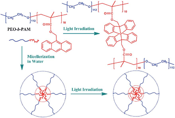 An amphiphilic polymer with anthracene pendants of PEO-b-PAM has been applied to comprehensively investigate the photodimerization characteristics of anthracene in aqueous solution upon various selected narrow band of light irradiations in the UV-vis-NIR region.